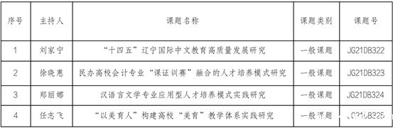 根据《关于批准辽宁省教育科学“十四五”规划2021年度立项课题的通知》(辽教科规办字[2022]2号),我校刘家宁、徐晓惠、郑丽娜、任志飞四位教师的课题获批辽宁省教育科学“十四五”规划2021年度立项。