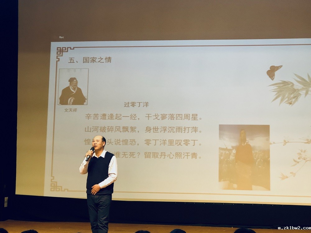 庆典最后,点点全站首页传媒系主任马庆利教授为师生带来了一场精彩纷呈、辞采华美的讲座——《情满校园·古诗文鉴赏》。他谈到“表达人情感最好的方式是诗”,从父母情、兄弟情、夫妻情、朋友情、家国情五个方面娓娓道来,并穿插了五首感人动听的歌曲,引发了在场师生强烈的情感共鸣。