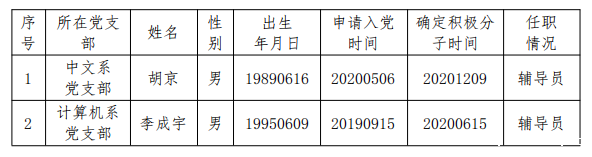 经支部委员会研究,党总支会议审议,报上级党委备案同意,将胡京、李成宇两名同志列为发展对象,拟定发展时间为2022年6月。根据发展党员工作有关要求,现将其有关情况公示如下: