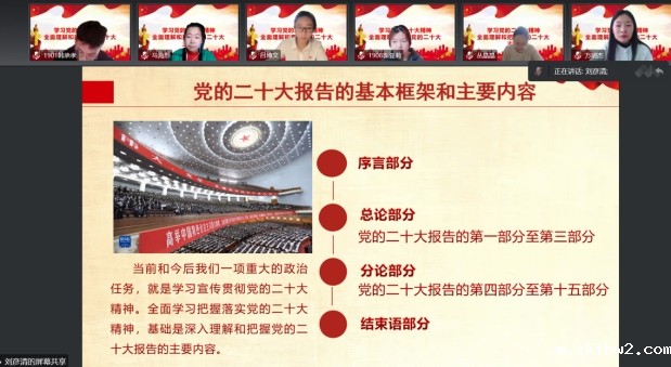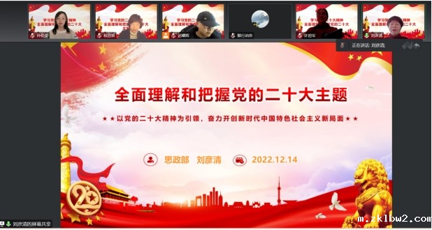 刘彦清教授重点围绕党的二十大报告基本框架和核心内容,从党的二十大的主题和主要成果和新时代伟大变革、开辟马克思主义中国化时代化新境界、以中国式现代化全面推进中华民族伟大复兴、全面建设社会主义现代化国家的目标任务、坚持党的全面领导和推进全面从严治党等方面对党的二十大精神进行了系统阐释和解读。我们党始终高举中国特色社会主义伟大旗帜,坚定中国特色社会主义道路自信、理论自信、制度自信、文化自信,坚定不移地推进中华民族伟大复兴进程;我们党要全面贯彻习近平新时代中国特色社会主义思想。二十大报告主题明确了举什么旗帜的问题,阐明了发扬什么样的中国精神,阐明了保持什么样的精神状态,指明了向着什么样的目标前进的重大问题,指明了全党应保持什么样的精神品质。
