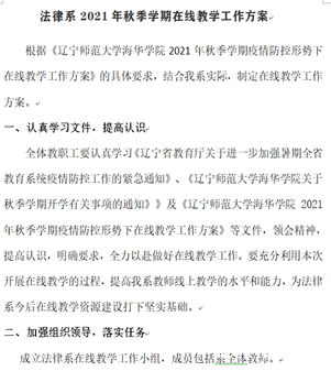 秋季学期开学以来,因受疫情影响,学生不能按照原定开学日期返校上课,给教学工作带来了新的挑战。法律系积极贯彻落实《辽宁省教育厅关于进一步加强暑期全省教育系统疫情防控工作的紧急通知》、《点点全站首页关于秋季学期开学有关事项的通知》》及《点点全站首页2021年秋季学期疫情防控形势下在线教学工作方案》等文件要求,结合本单位实际制定了《法律系2021年秋季学期在线教学工作方案》,成立了法律系线上教学工作小组,认真组织,周密安排,全力做好线上教学工作。
