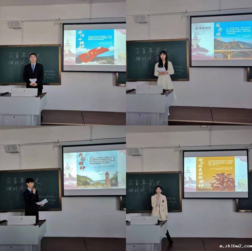活动开始,主持人李文广从“以史为鉴,可以知兴替;感悟党史,积蓄奋斗力量;认识过去,在于传承精神”等方面说明本次活动的意义。紧接着八位主讲人一一上台发言:赵明慧同学讲解“红船精神”、徐江洋同学讲述井冈山精神历史、张喆同学分享长征故事、冯广燕同学讲解“遵义会议精神”、张馨文同学讲述“延安精神”、赵蕴博同学分享了“西柏坡精神、马诗惠同学带来“伟大抗美援朝精神”、孙溪源同学分享了“伟大抗疫精神”。