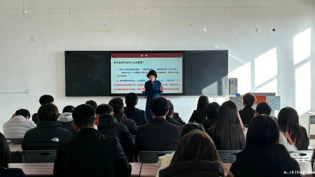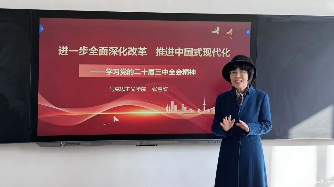会上,张慧欣教授从三个方面为我们深入阐释了党的二十届三中全会精神。首先,党的二十届三中全会的召开是划时代的,它如航标指引,在历史关键节点为国家发展明确了新路径。其次,本次大会明确了中国式现代化的“三重”制度支撑,以党的领导为核心,多制度联动,为现代化构建稳固制度框架。最后,本次大会提出了进一步全面深化改革新举措,从多领域协同发力,激活现代化建设的持续发展动力。张教授生动形象地为我们深入剖析了其重要意义与具体内涵。张教授还与同学们积极互动,解答同学们提出的问题。此次宣讲会,同学们收获满满,纷纷表示把党的二十届三中全会精神落实到学业与工作中,为中国式现代化奋力前行。