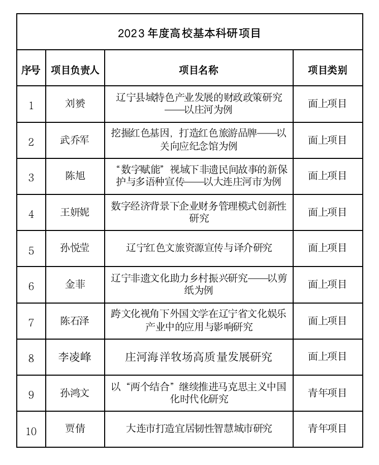 根据《辽宁省教育厅办公室关于开展2023年度高校基本科研项目申报工作的通知》(辽教办〔2023〕274号)文件要求,经项目负责人申请,依据《通知》的评选原则和评选条件,按照教育厅限定的推荐名额和要求,我校组织专家评审,最终评选出面上项目8项,青年项目2项,详见下表。(以下排序不分先后)。