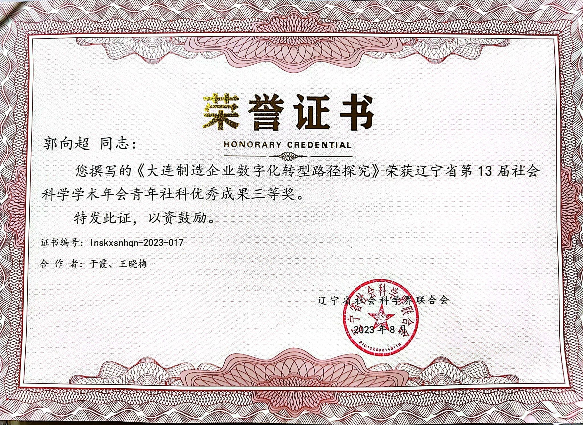 2023年8月26日,根据《关于2023年辽宁省社会科学学术年会征文获奖成果的通报》[辽社科联发(2023)22号]文件,我校郭向超攥写的《大连制造企业数字化转型路径探究》在辽宁省第13届社会科学学术年会中获青年社科优秀成果三等奖。