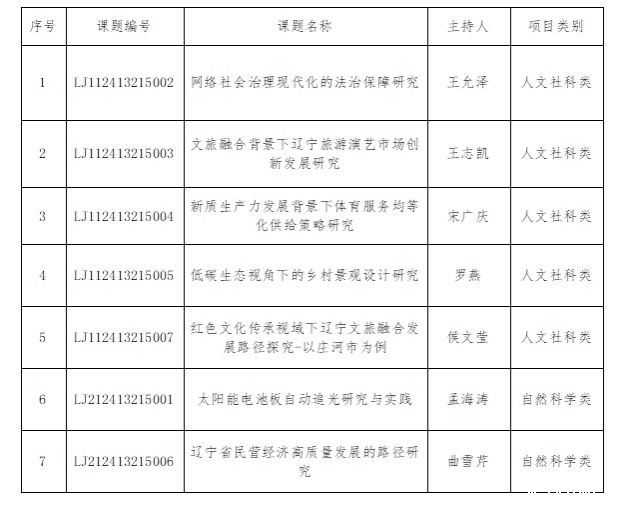近日,根据辽宁省教育厅发布的《关于公布2024年度高校基本科研项目立项结果的通知》,我校获批辽宁省教育厅2024年度高校基本科研项目共计8项,均为自主选题项目,其中5项为人文社科类项目,2项为自然科学类项目。