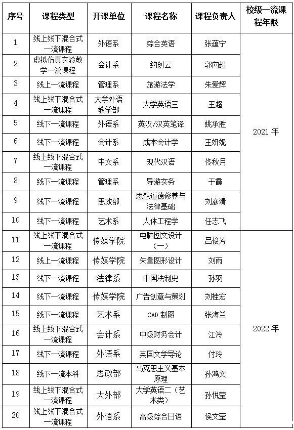 根据《辽宁省教育厅办公室关于开展2022年省级一流本科课程推荐工作的通知》(辽教办〔2022〕251号)文件精神,教务处于近期组织开展了2022年校级一流课程评审及2022年省级一流课程的遴选推荐工作。按照省教育厅对省级一流本科课程的限额要求,我校10门2021年校级一流本科课程直接获得推荐资格。本次评审中,各院(系、部)共推荐上报13门课程,根据评审专家的评分结果,共评选出10门课程作为2022年校级一流本科课程。综上,本次共推荐我校20门课程(详见附表)申报2022年省级一流本科课程。现对推荐结果进行公示,公示期为3天(2022年10月6日至2022年10月8日)。如有异议,请于公示期内向教务处反映。